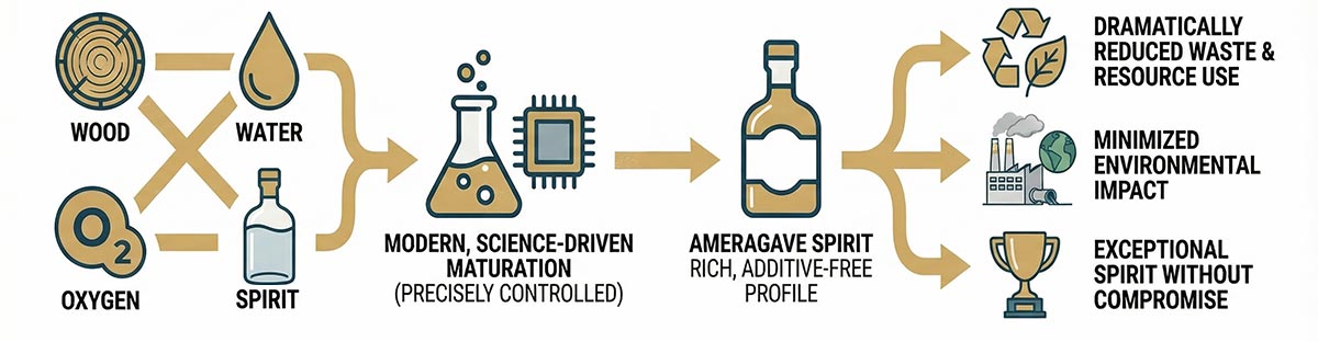 For Gold, the approach unlocked a much larger advantage. By precisely controlling the interactions of wood, water, oxygen, and spirit, Barrel RM replicated the core effects of traditional aging without requiring months or years of passive barrel time. This allowed Ameragave to develop a rich, additive-free, oak-influenced profile while reducing waste, resource use, and environmental impact.
